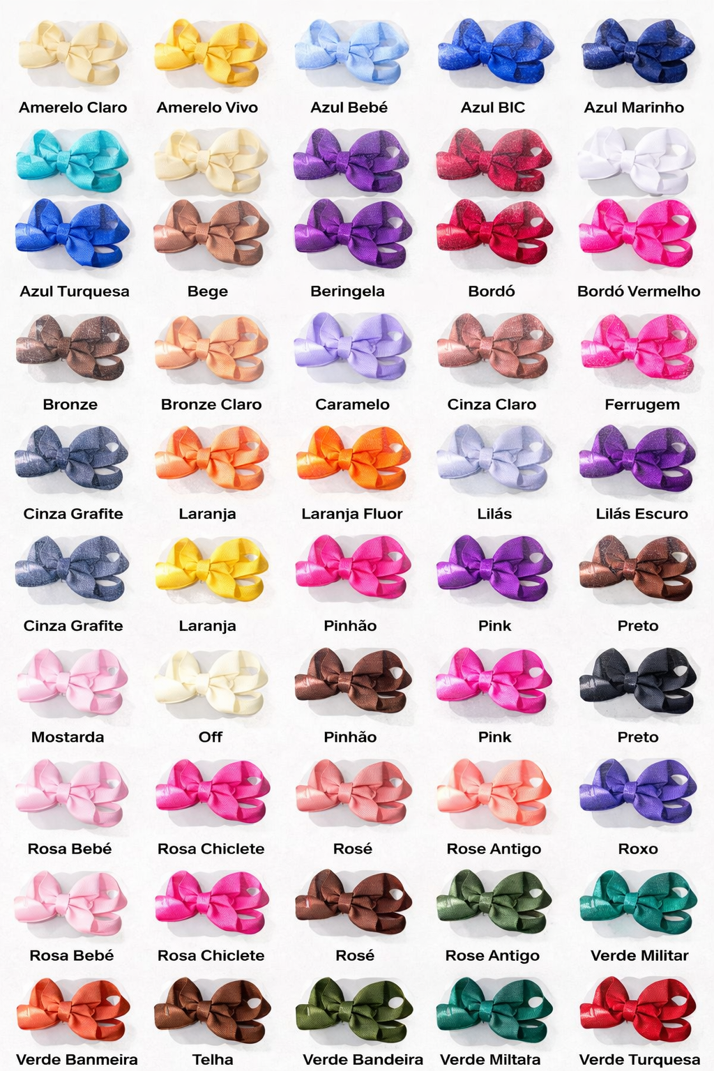 | Cores | amarelo claro, amarelo vivo, azul bebê, azul BIC, azul marinho, azul piscina, azul turquesa, bege, beringela, bordo, bordo vermelho, branco, bronze, bronze claro, caramelo, cinza, ferrugem, fucsia, grafite, laranja, laranja fluor, lilas, lilas escuro, marrom, mostarda, off, pinhão, pink, pink fluor, preto, rosa bebê, rosa chiclete, rose, rose antigo, rose clarinho, roxo, salmão, telha, terra, verde bandeira, verde escuro, verde militar, verde musgo, verde pimenta, verde turquesa, vermelho |