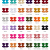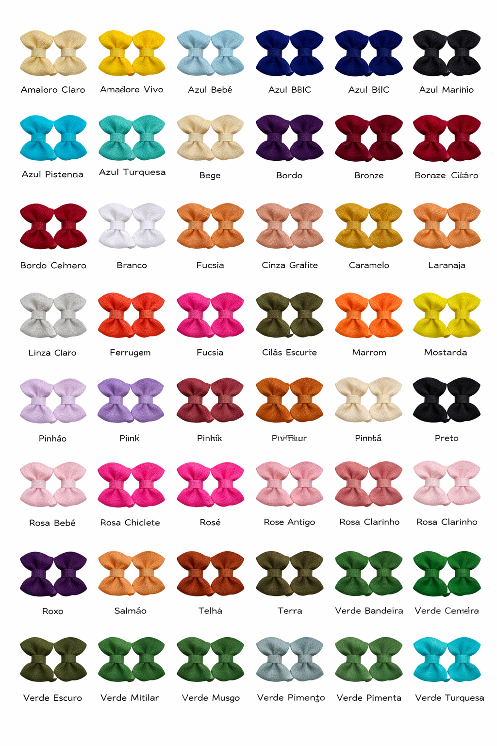 | Cores | amarelo claro, amarelo vivo, azul bebê, azul BIC, azul marinho, azul piscina, azul turquesa, bege, beringela, bordo, bordo vermelho, branco, bronze, bronze claro, caramelo, cinza, ferrugem, fucsia, grafite, laranja, laranja fluor, lilas, lilas escuro, marrom, mostarda, off, pinhão, pink, pink fluor, preto, rosa bebê, rosa chiclete, rose, rose antigo, rose clarinho, roxo, salmão, telha, terra, verde bandeira, verde escuro, verde militar, verde musgo, verde pimenta, verde turquesa, vermelho |