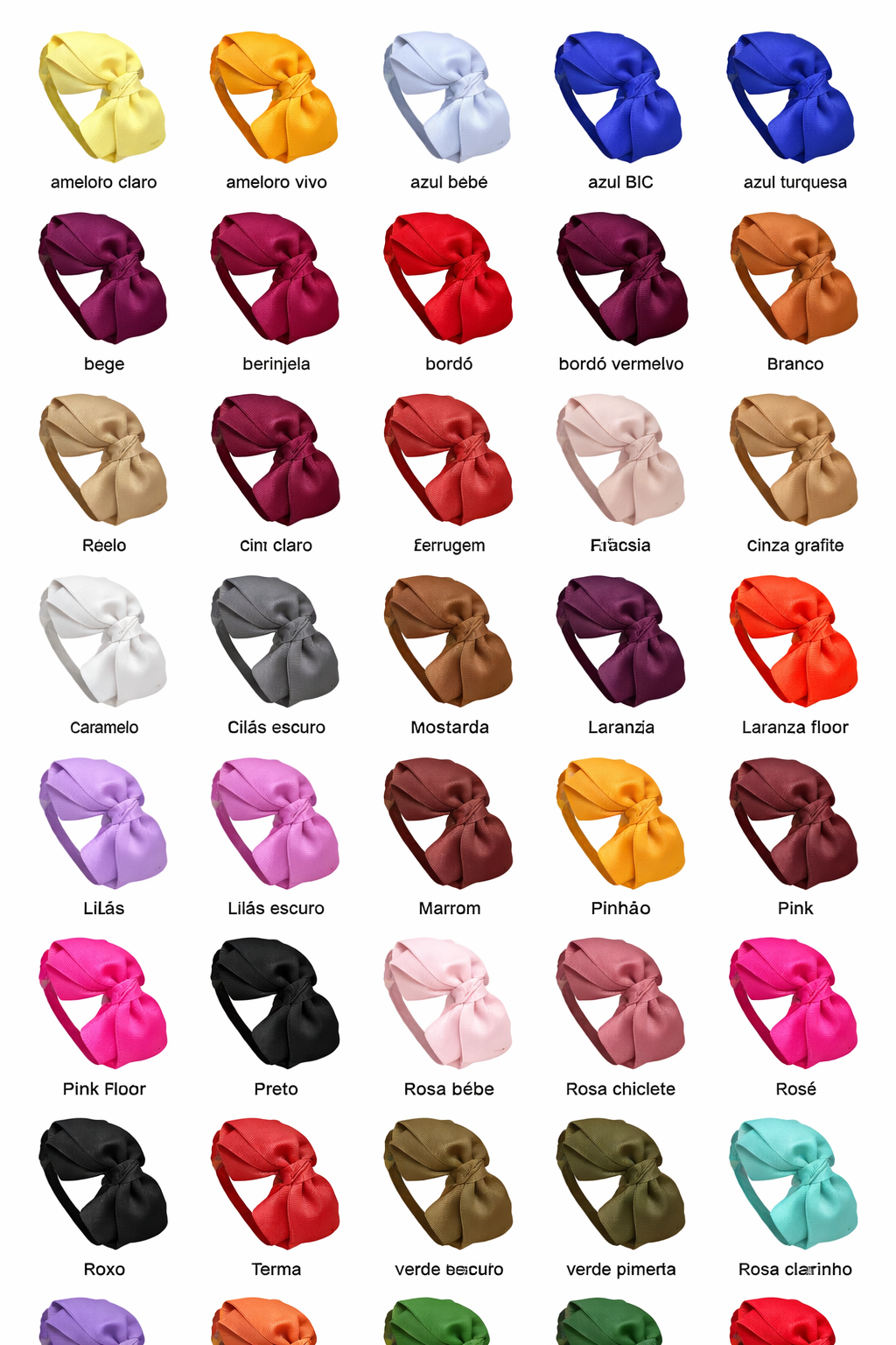 | Cores | amarelo claro, amarelo vivo, azul bebê, azul BIC, azul marinho, azul piscina, azul turquesa, bege, beringela, bordo, bordo vermelho, branco, bronze, bronze claro, caramelo, cinza, ferrugem, fucsia, grafite, laranja, laranja fluor, lilas, lilas escuro, marrom, mostarda, off, pinhão, pink, pink fluor, preto, rosa bebê, rosa chiclete, rose, rose antigo, rose clarinho, roxo, salmão, telha, terra, verde bandeira, verde escuro, verde militar, verde musgo, verde pimenta, verde turquesa, vermelho |