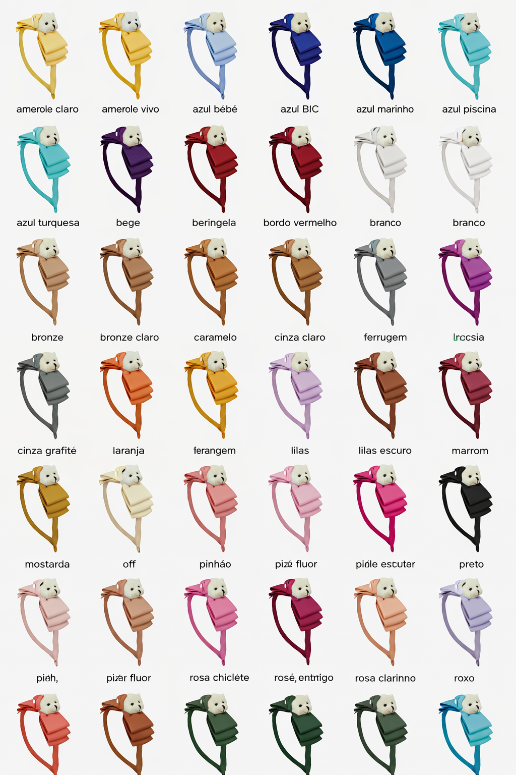 | Cores | amarelo claro, amarelo vivo, azul bebê, azul BIC, azul marinho, azul piscina, azul turquesa, bege, beringela, bordo, bordo vermelho, branco, bronze, bronze claro, caramelo, cinza, ferrugem, fucsia, grafite, laranja, laranja fluor, lilas, lilas escuro, marrom, mostarda, off, pinhão, pink, pink fluor, preto, rosa bebê, rosa chiclete, rose, rose antigo, rose clarinho, roxo, salmão, telha, terra, verde bandeira, verde escuro, verde militar, verde musgo, verde pimenta, verde turquesa, vermelho |